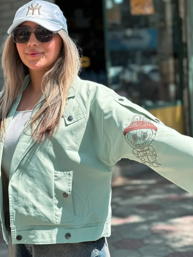 - گلدوزی فانتزی “لبوبو”: نقطه قوت و جذابیت اصلی این مدل، گلدوزی خاص و عروسکی “لبوبو” روی آستین است. این جزئیات هنرمندانه، جلوهای خاص و بازیگوش به کت بخشیده و آن را از یک ترنچ کت ساده متمایز میکند.