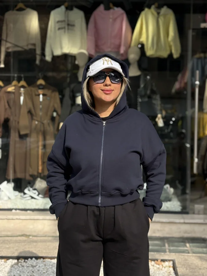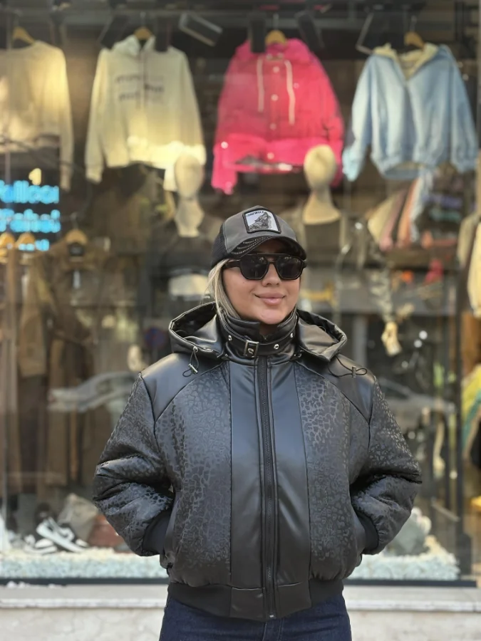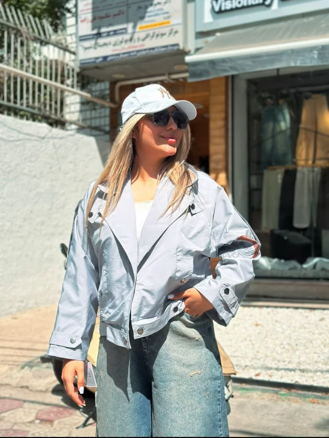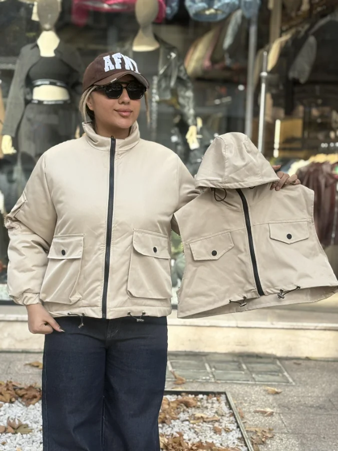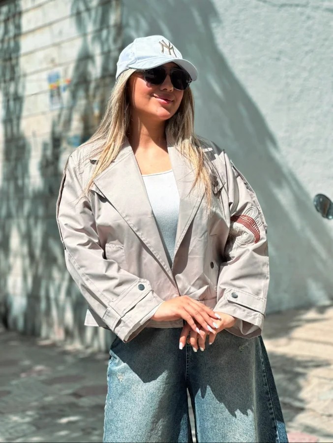 - طراحی مدرن و کژوال: با یقههای پهن، مدل آستین کمی آزاد و سرشانه افتاده (دراپ شولدر)، این کاپشن کوتاه ظاهری شیک و امروزی دارد. دکمههای پرسی جلوی کار و جیبهای کاربردی، به تکمیل این استایل کمک کردهاند.
