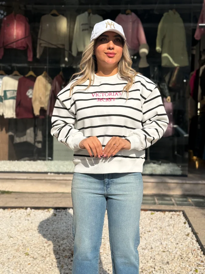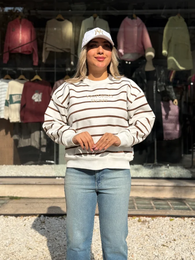 طراحی شیک و راه راه: این دورس راه راه با نوارهای افقی در سه ترکیب رنگی جذاب (مشکی، کرم و قهوهای) و لوگوی ظریف ویکتوریا سکرت روی سینه، یک استایل کژوال اما در عین حال شیک را برای شما به ارمغان میآورد. مناسب برای هر موقعیتی که میخواهید هم راحت باشید و هم خوشپوش.