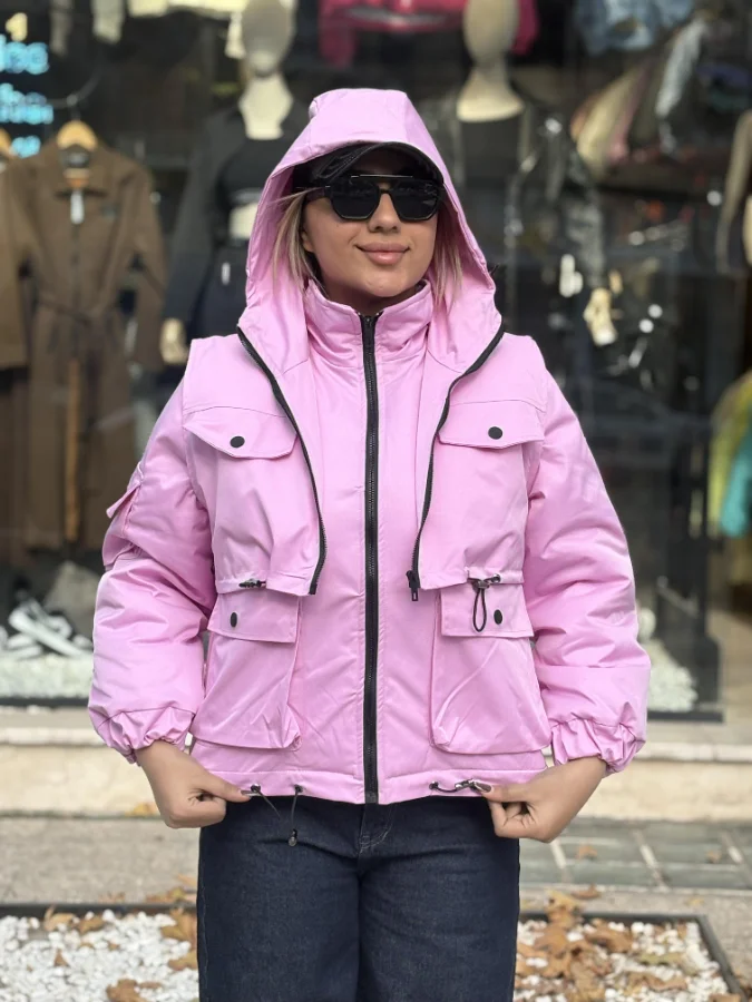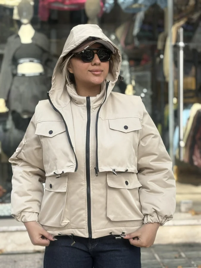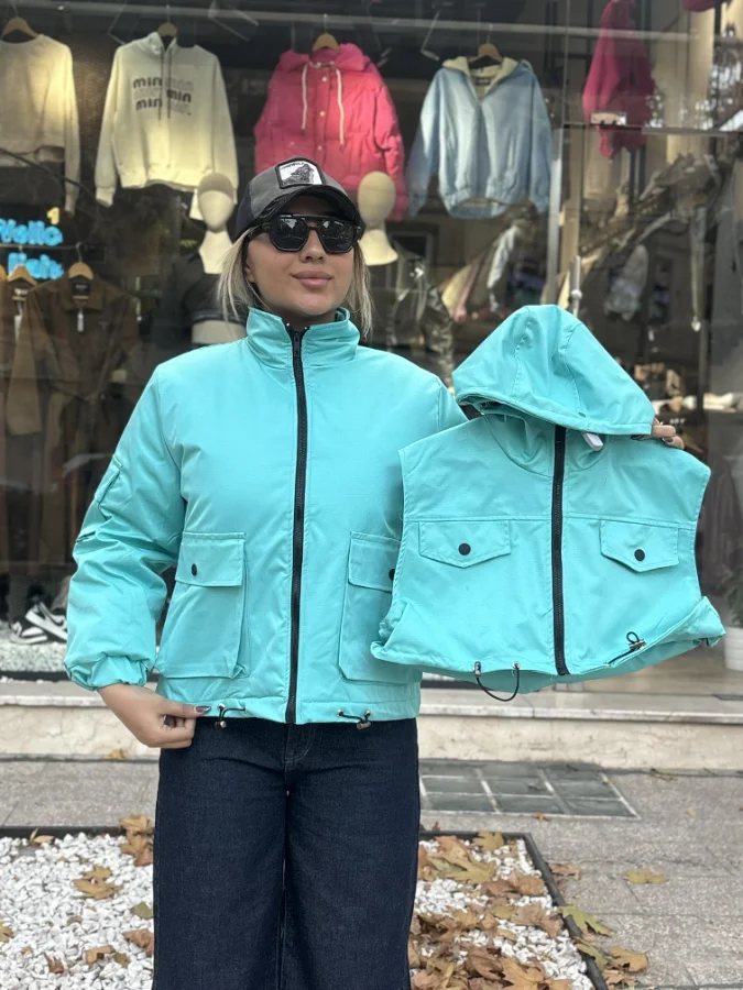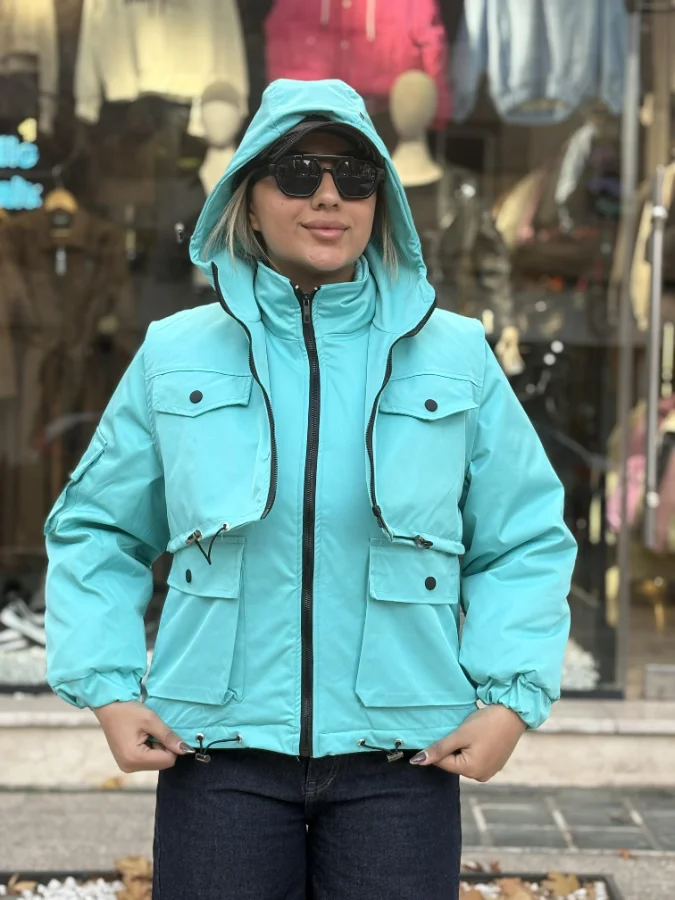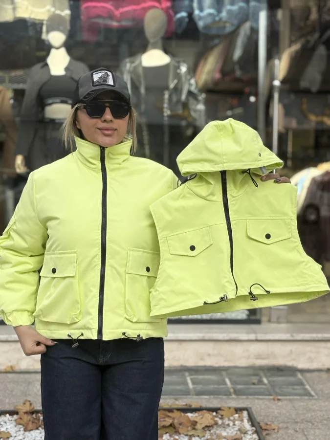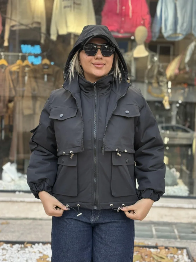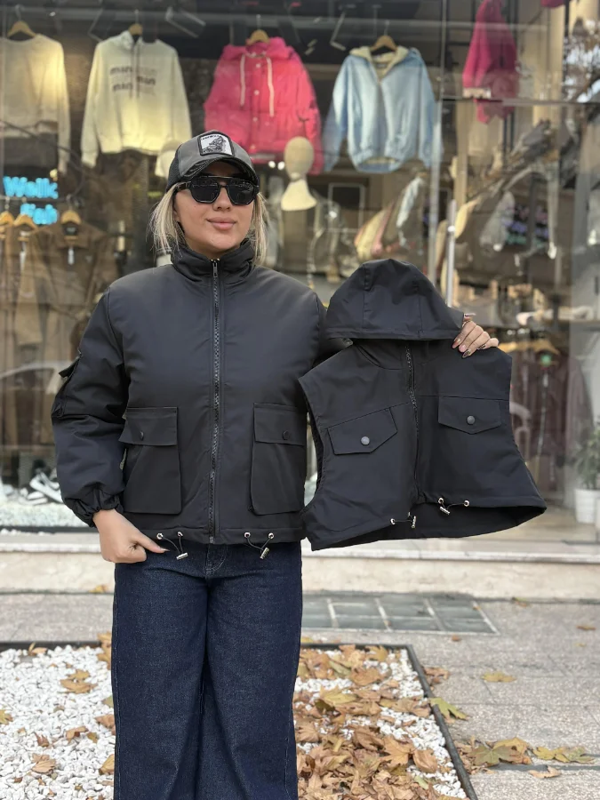 - کاپشن دوتیکه و کاربردی: شامل یک کاپشن یقه ایستاده و یک وست کلاهدار با قابلیت جدا شدن و استفاده مجزا، که به شما امکان خلق ۳ استایل متفاوت را میدهد.